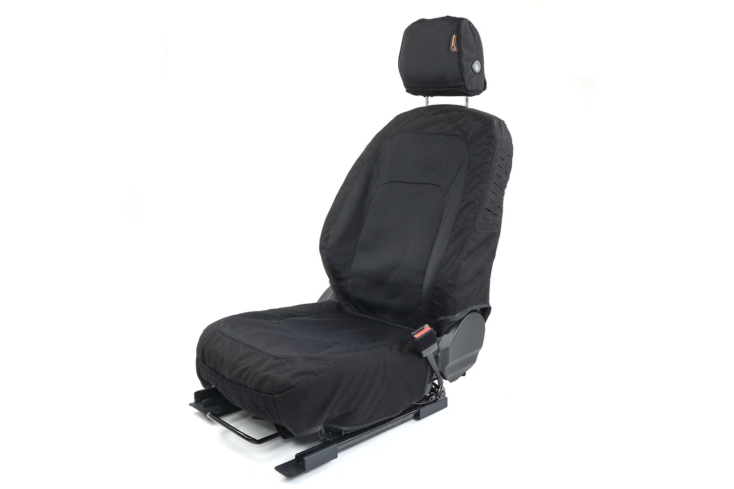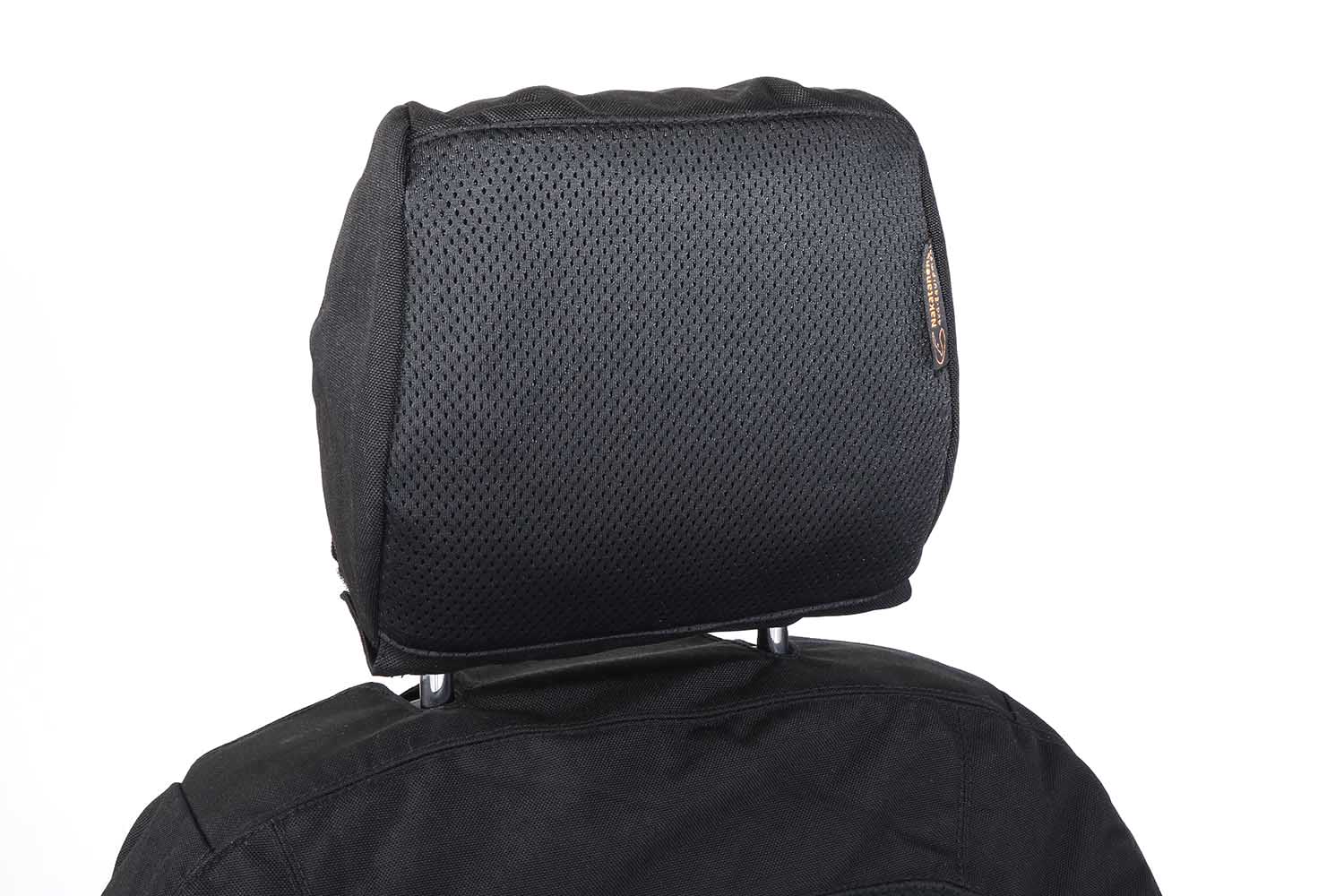 In order to achieve an absolute fit, the one-piece cover is cut quite tightly and does not need any zippers or the like. It is simply slipped over the seat and fastened under the headrest with Velcro and fixed under the seat with stable straps and click fasteners. In addition, a mesh insert with a foam insert is clamped in the gap between the seat and the backrest to prevent annoying slipping. The headrests can still be easily adjusted via side recesses.